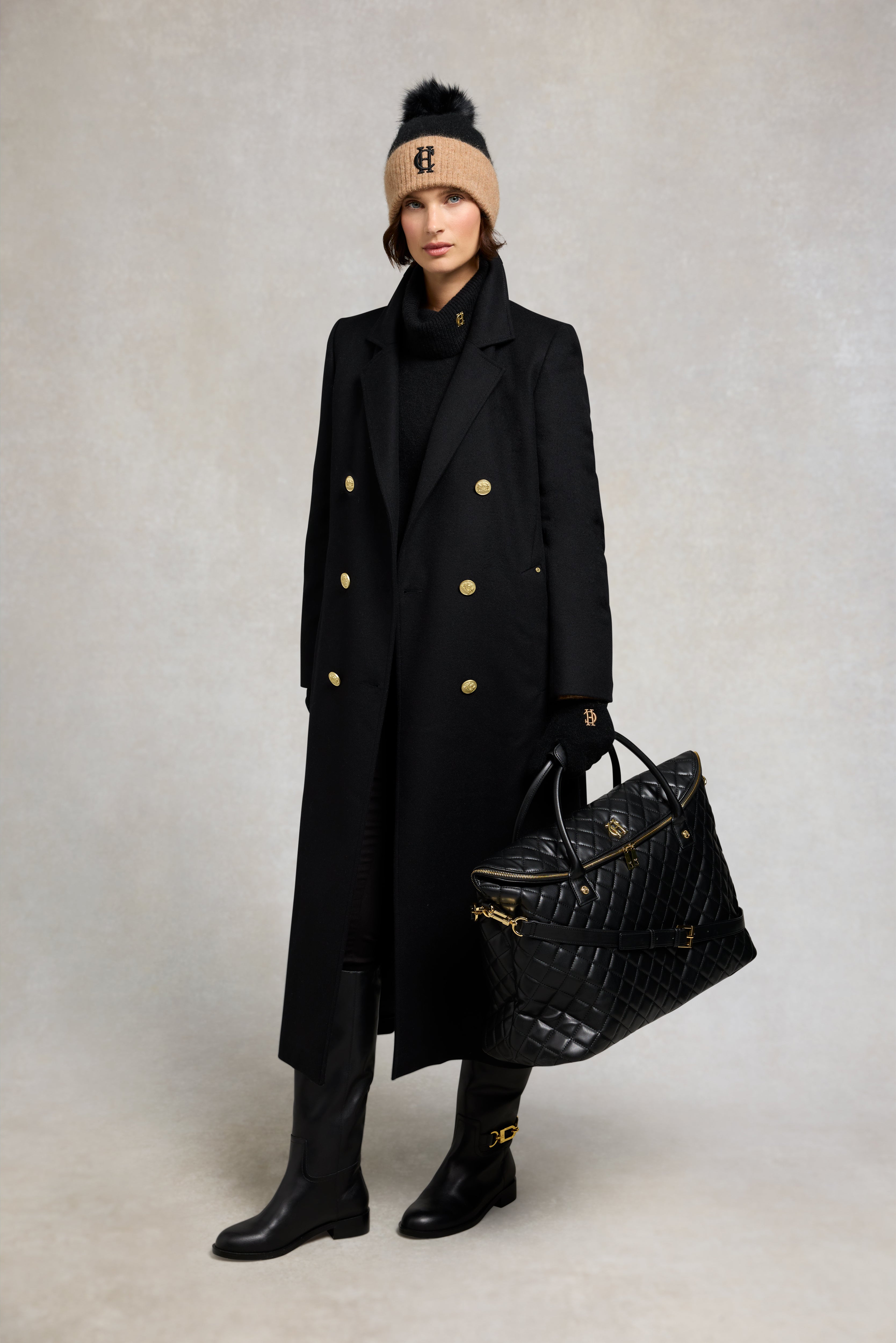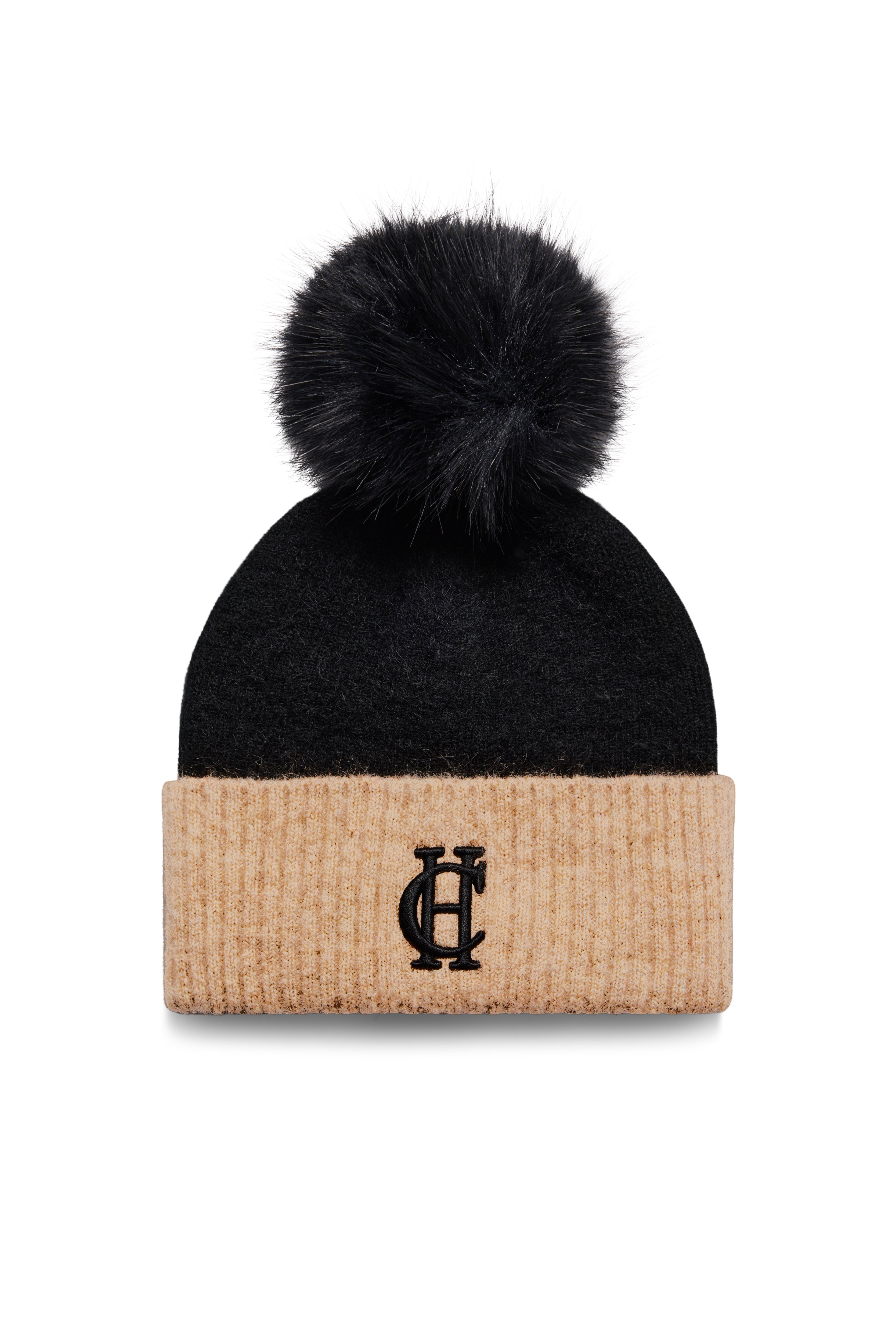• A new addition designed to perfectly complement our Lightweight Monogram Scarf Collection. Crafted in classic camel and black, this hat features high build embroidery for a refined touch. The chunky ribbed cuff adds both style and warmth, making the Chelsea Marino Bobble Hat a versatile and elegant accessory for your winter wardrobe.