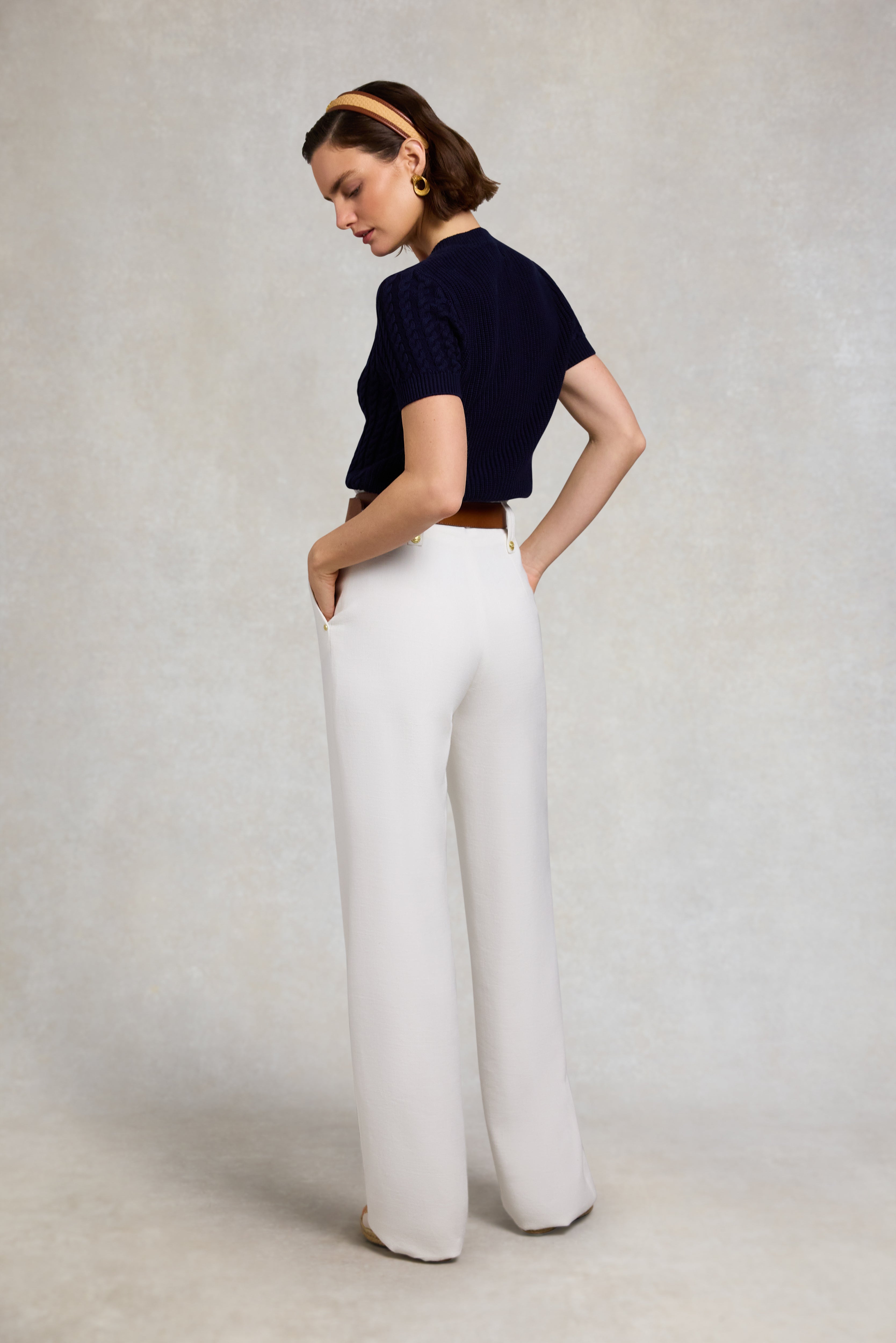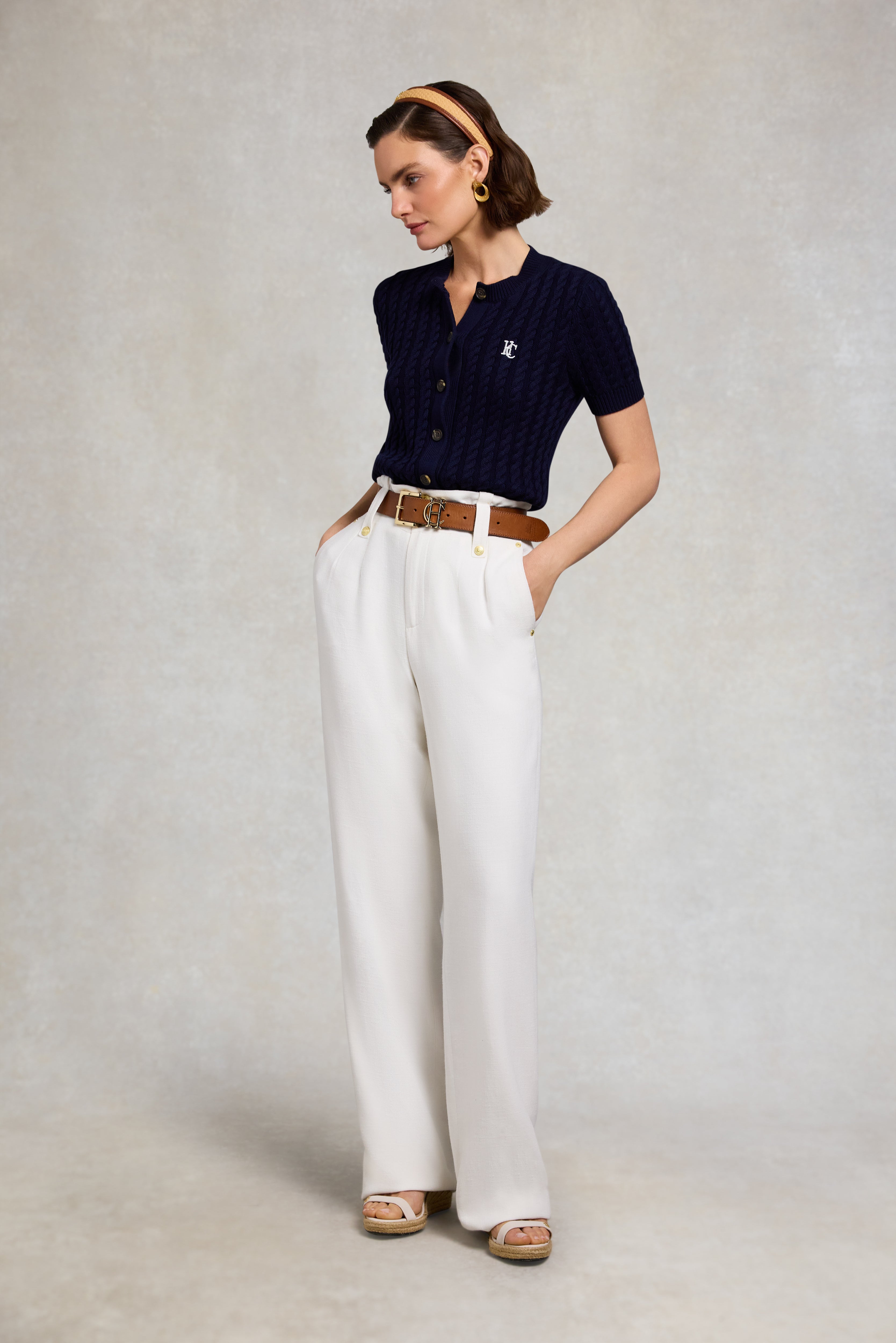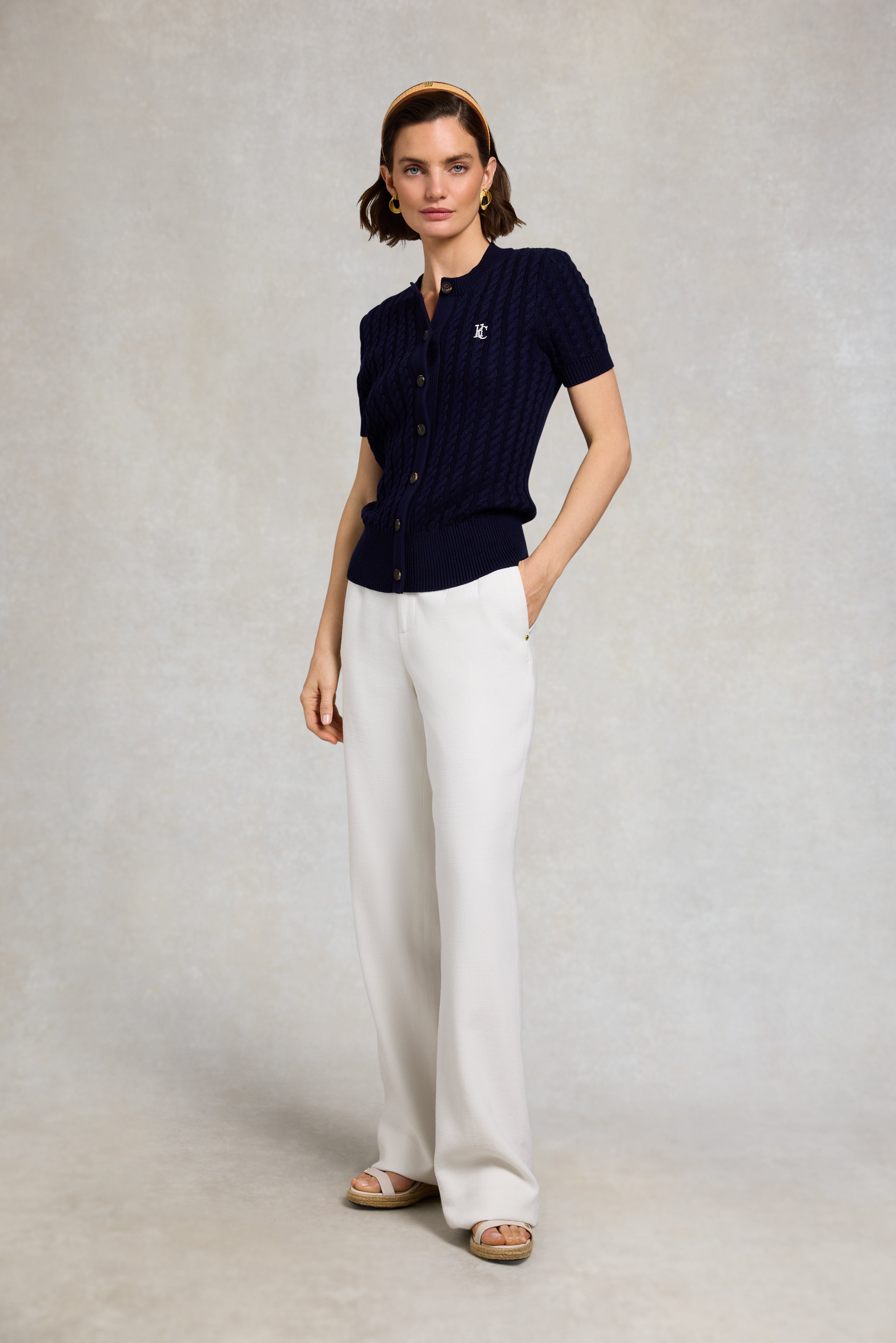 A signature Holland Cooper piece, reimagined for the season, the Cotswold Short Sleeve Cardigan offers a fresh take on a timeless favourite. Cut to a flattering regular fit, this elevated knit features classic ribbed cuffs, collar and hem for a structured, heritage-inspired silhouette. Designed with short sleeves for warmer-weather wear, it is finished with a faux placket, with the top two buttons fully functional for versatile styling. Contrast HC embroidery to the chest completes the look. A refined staple that transitions effortlessly between seasons. Size and fit True to size Regular fit Body length from side of neck to hem: 59cm Sizes XS-XL Details Ribbed cuff, collar and hem Contrast HC embroidery to chest Faux placket - two top buttons functional Composition 100% Cotton