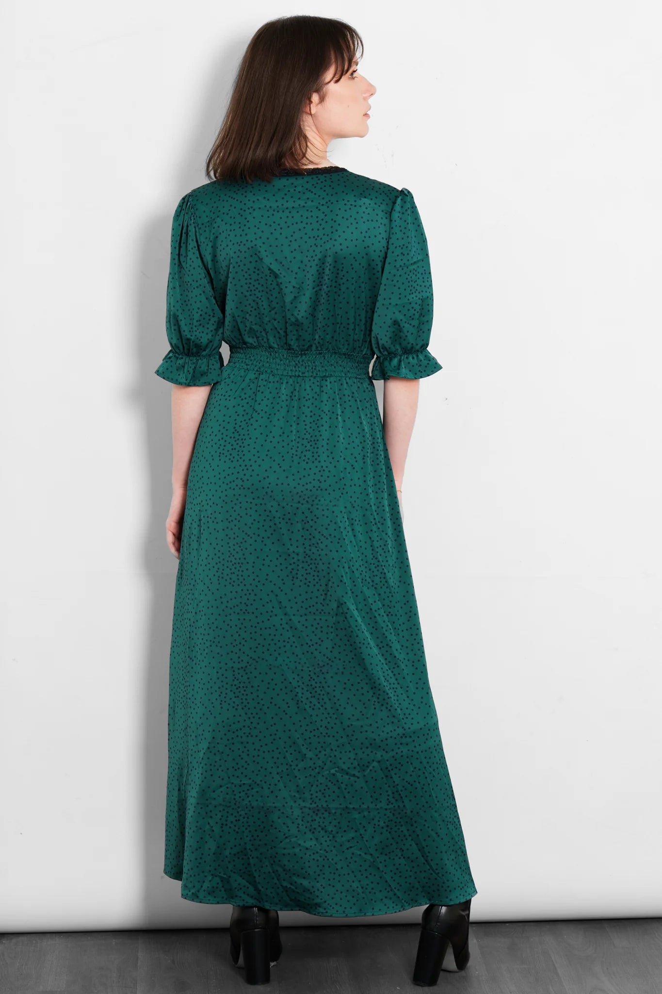 A chic polka dot midi tea dress crafted from soft silky viscose. This classic piece features an elongated V-neck, short puff sleeves and a flattering high waist. An ideal occasion piece, this tea dress can be worn for parties, cocktails and special events.