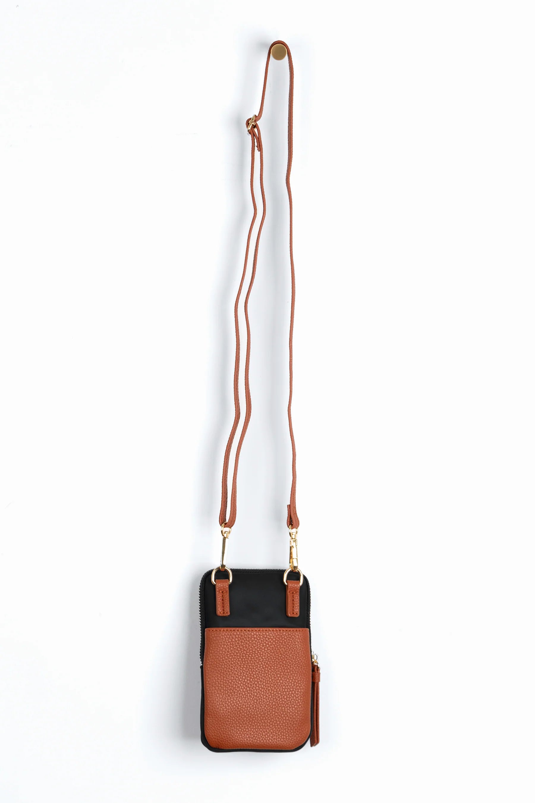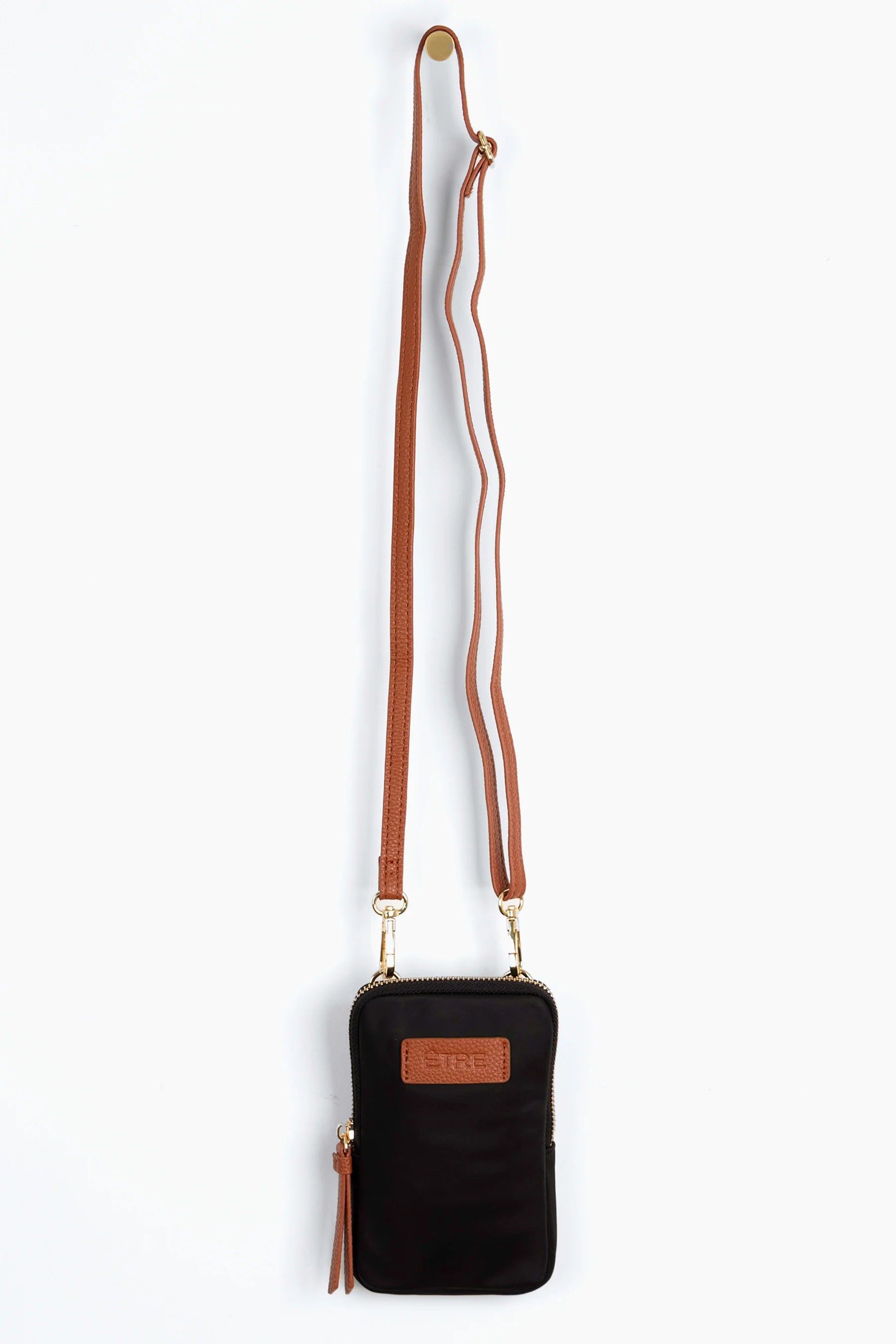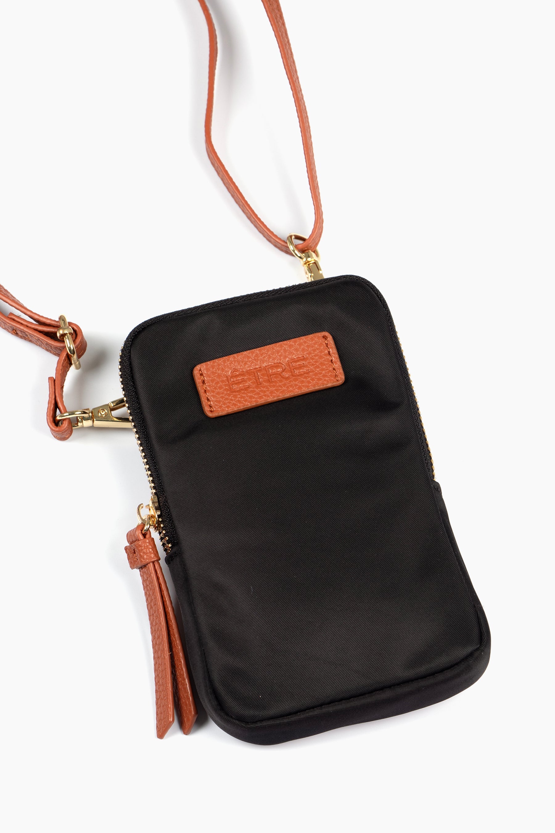 A classic black and tan phone bag, crafted from lightweight durable nylon with PU faux leather accents. A small crossbody bag designed to carry just your phone and cards. Featuring an adjustable, removable crossbody strap, large internal pocket and an external zip closure.