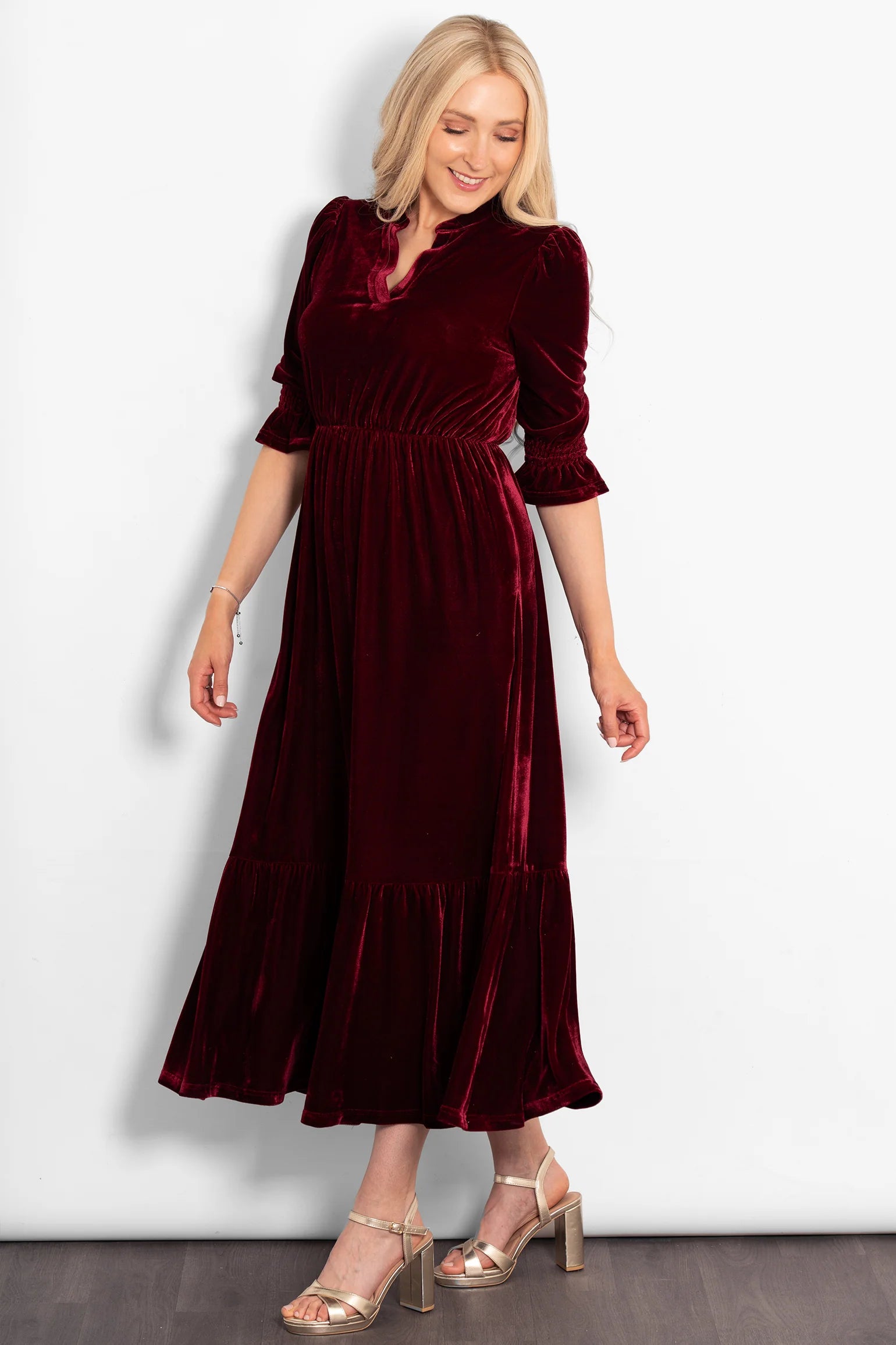 A classic midaxi dress crafted from soft velvet fabric. Showcasing an open V-neck collar, tiered hem and fluted cropped sleeves. This dress is the perfect occasion piece designed to create a flattering silhouette.