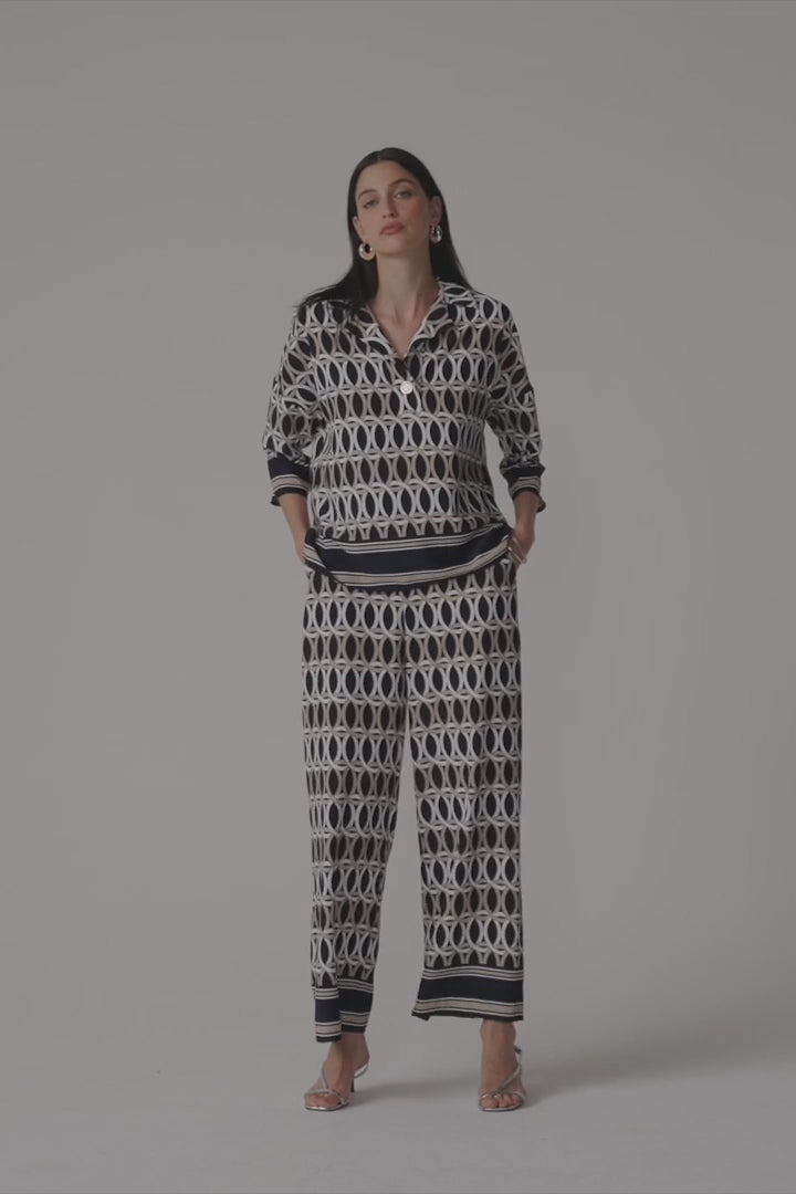 Sophisticated with a statement edge, these recycled woven pants feature a bold status chain border print, side pockets, and a comfortable shirred elastic waistband at the back.
