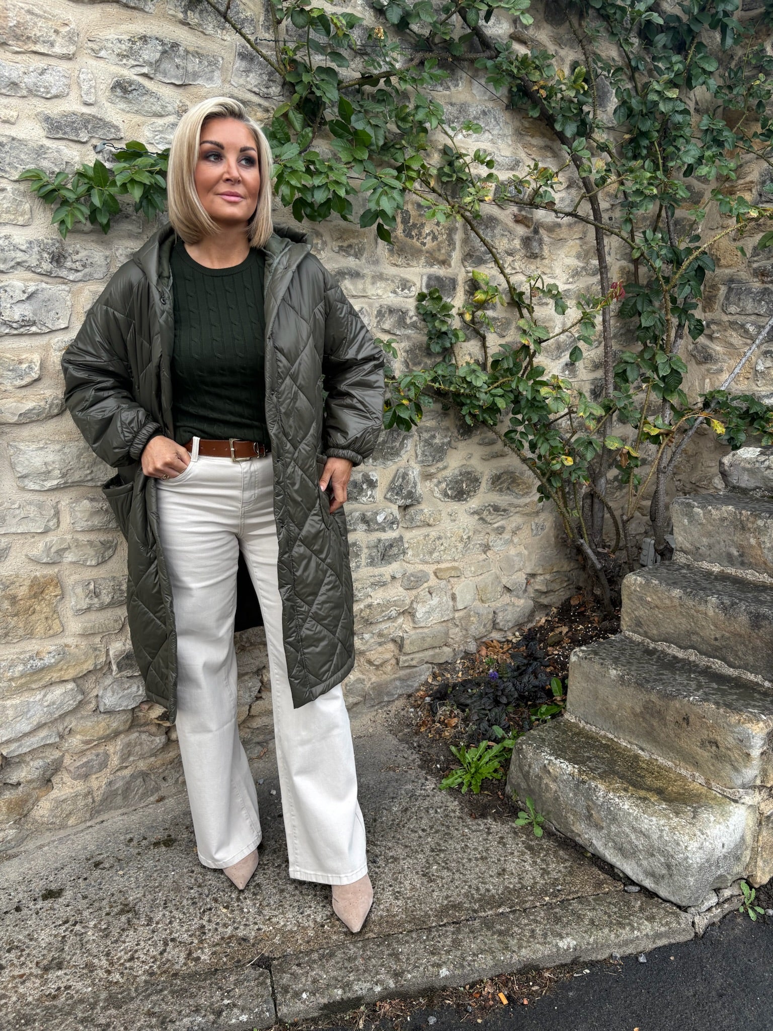 Nico Puffa Coat in Sage Green. Designed with practical pockets and a sleek silhouette, this coat offers warmth without compromising style. Its muted green hue adds a refined touch, perfect for sophisticated layering during cooler days.