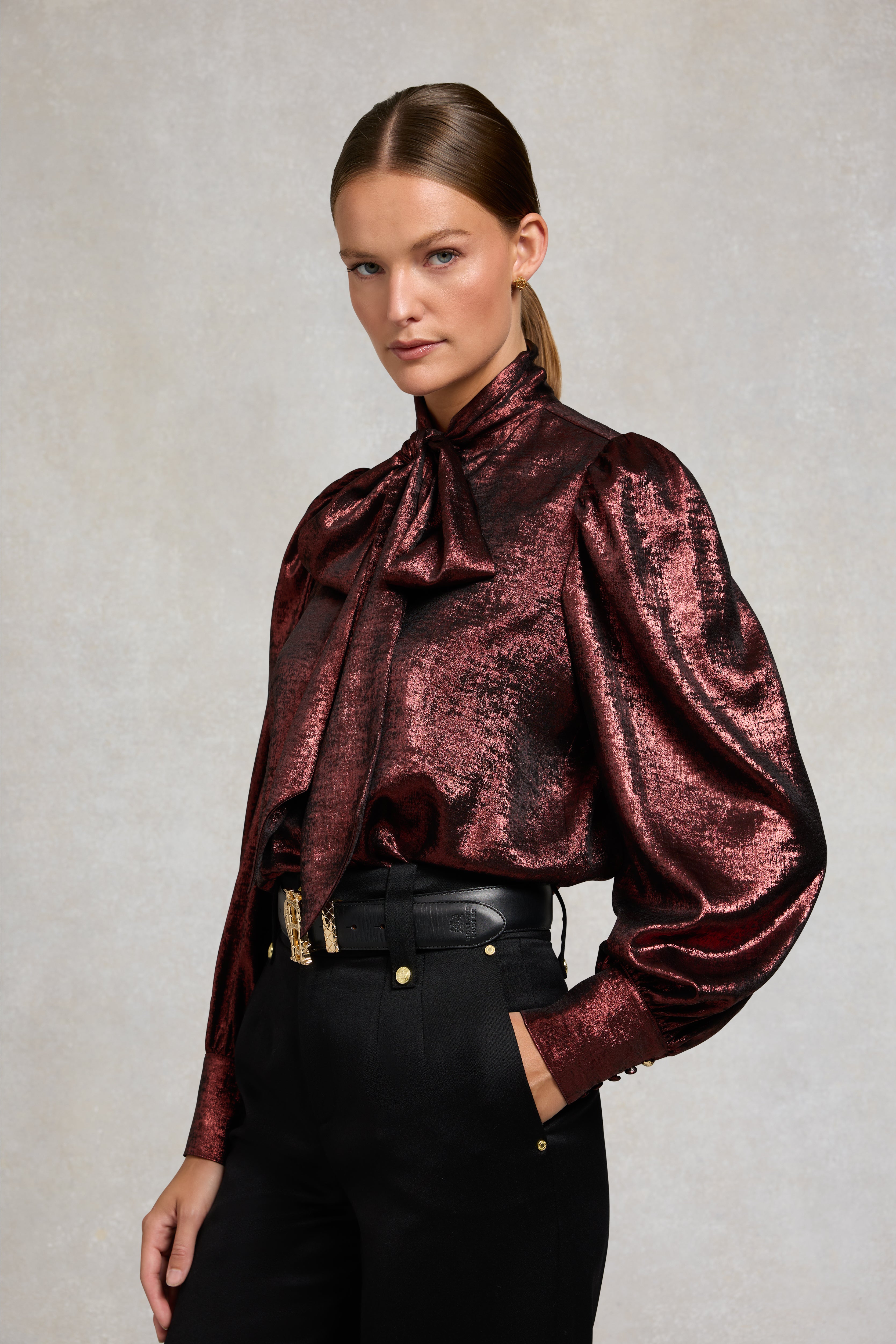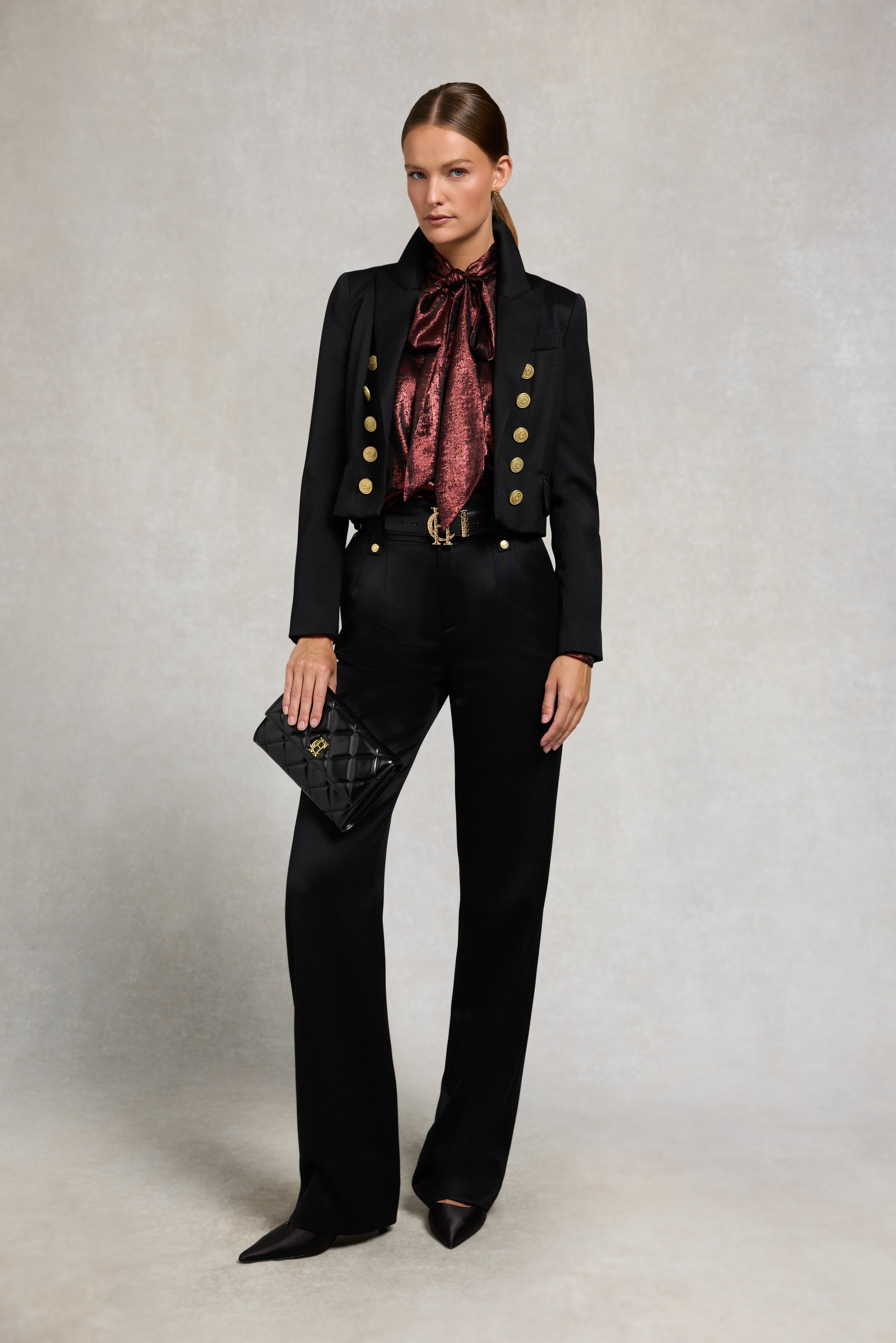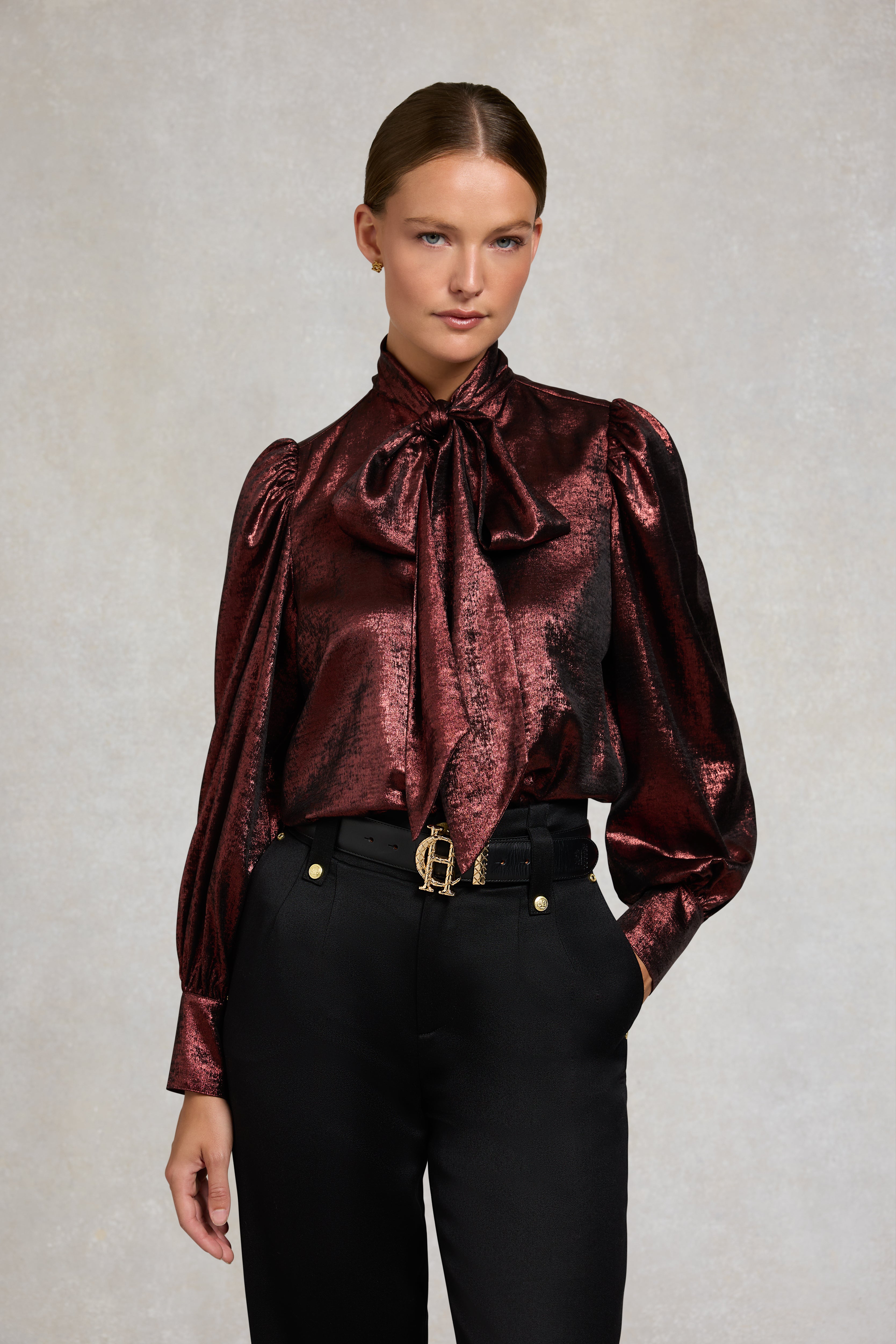 Designed with a fluid drape with a statement oversized bow collar, this blouse has been beautifully created from an elegant satin fabric. Curated to be fitted on the shoulders with a looser fit through the body, the extended cuffs enhance the feminine silhouette of this piece. Detailed with our iconic gold hardware & HC branding to the back yolk.