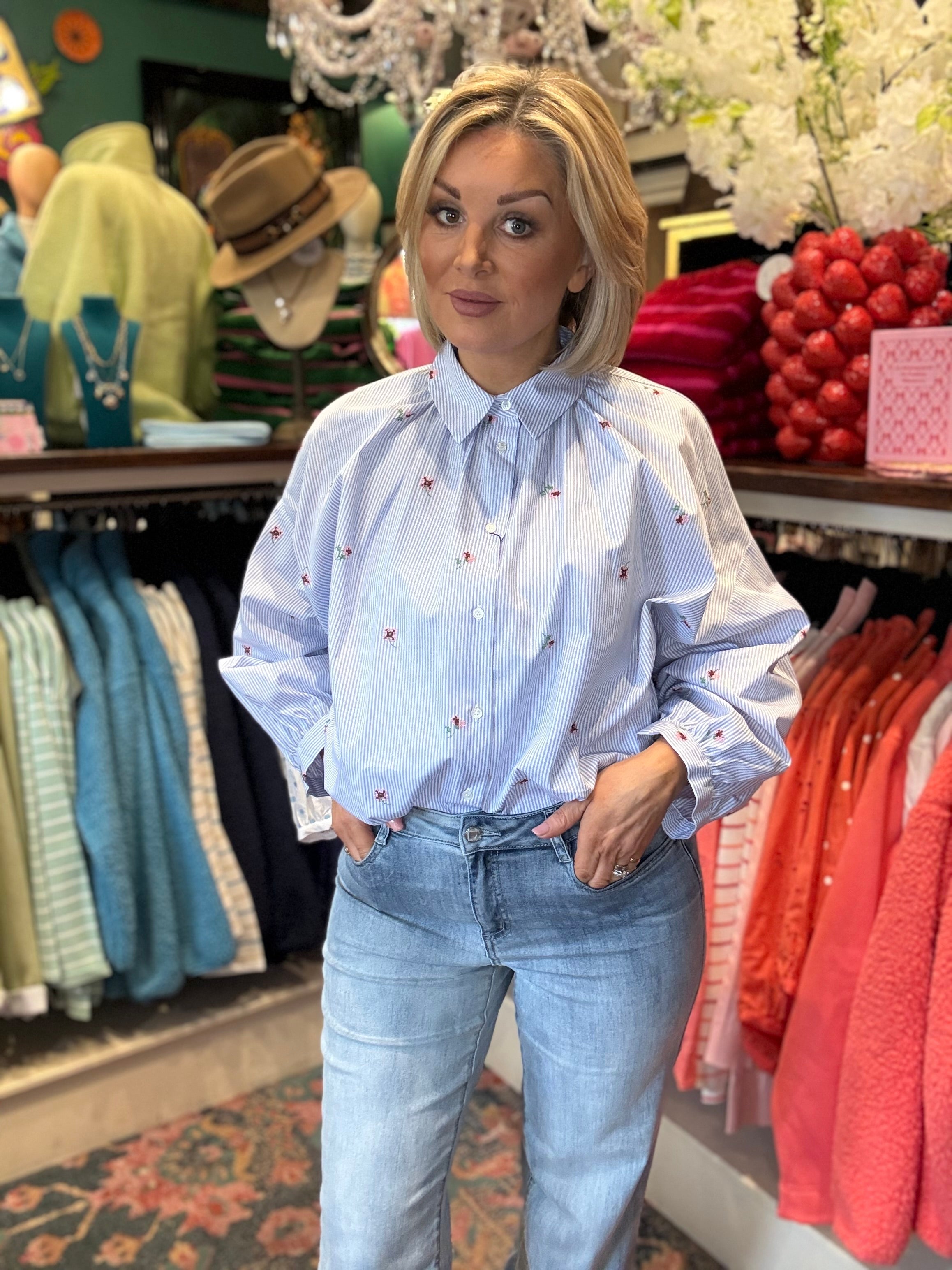 Elevate your everyday wardrobe with this stunning Max Mara cotton shirt in a crisp blue stripe. The delicate flower detail adds a touch of personality that sets it apart, while the versatile design works beautifully worn loose or tucked in for a polished finish. Crafted from 100% cotton for breathable comfort, this piece transitions effortlessly from casual days to dressed-up occasions. A timeless essential that brings understated elegance to any outfit.