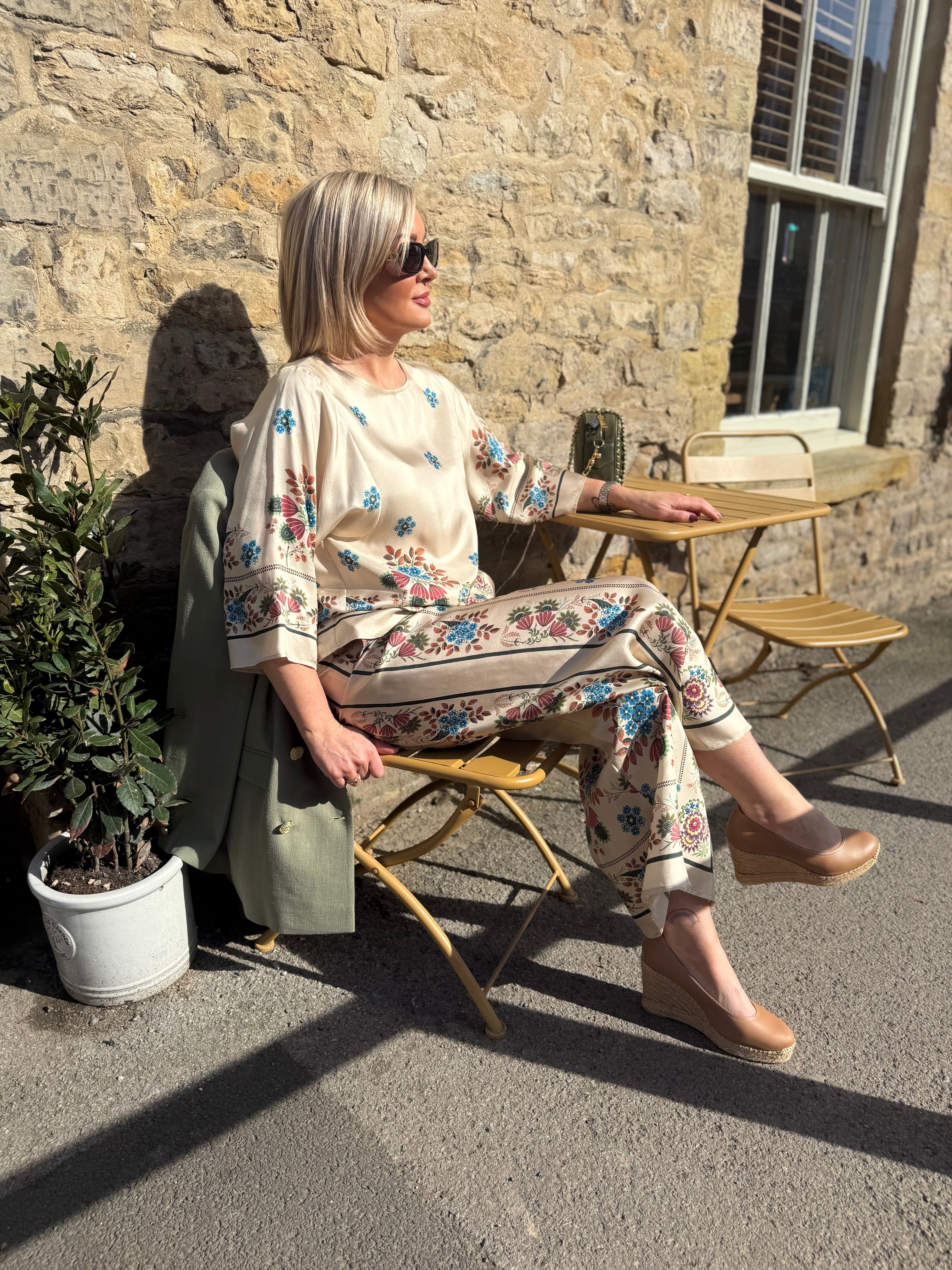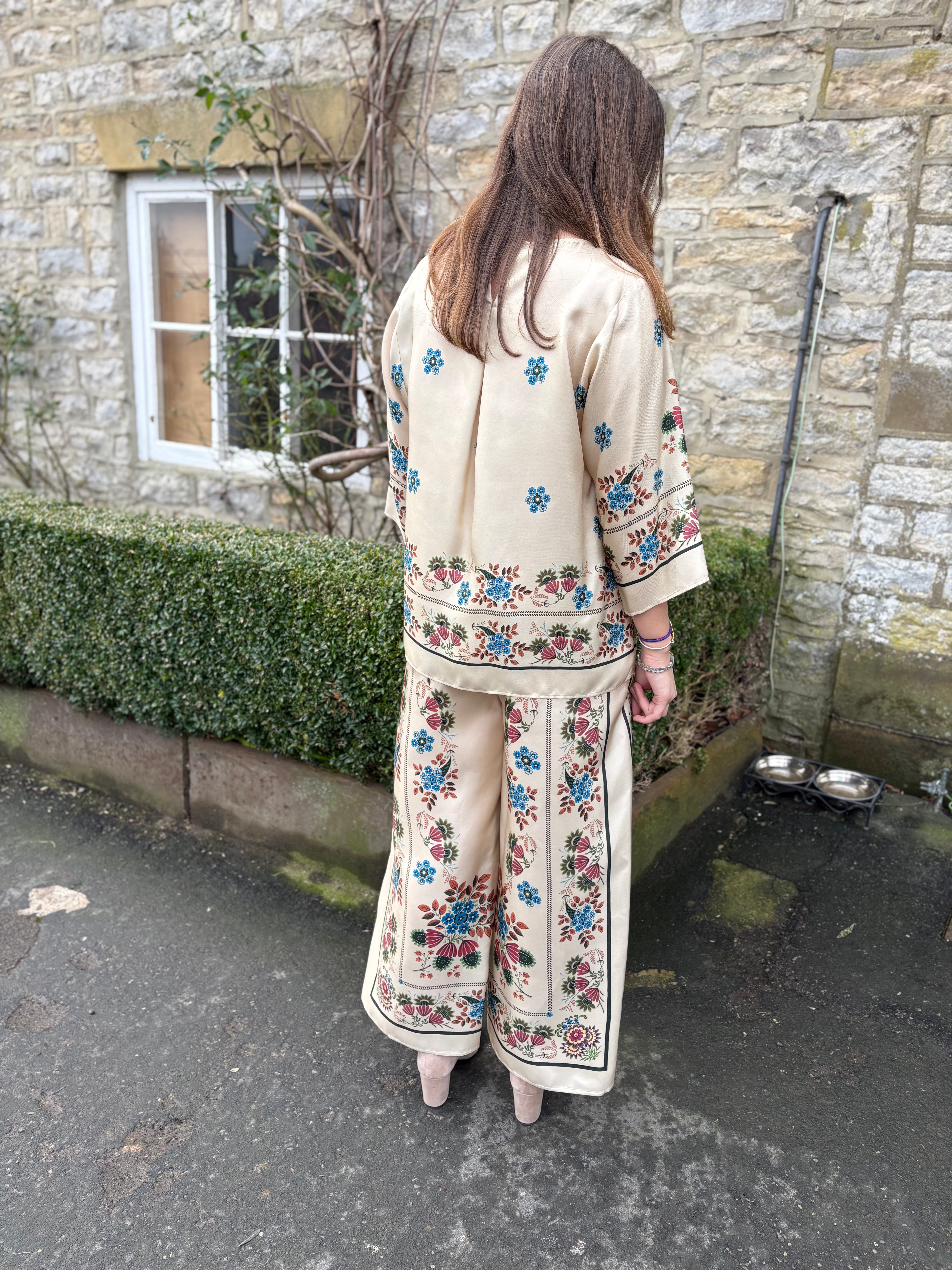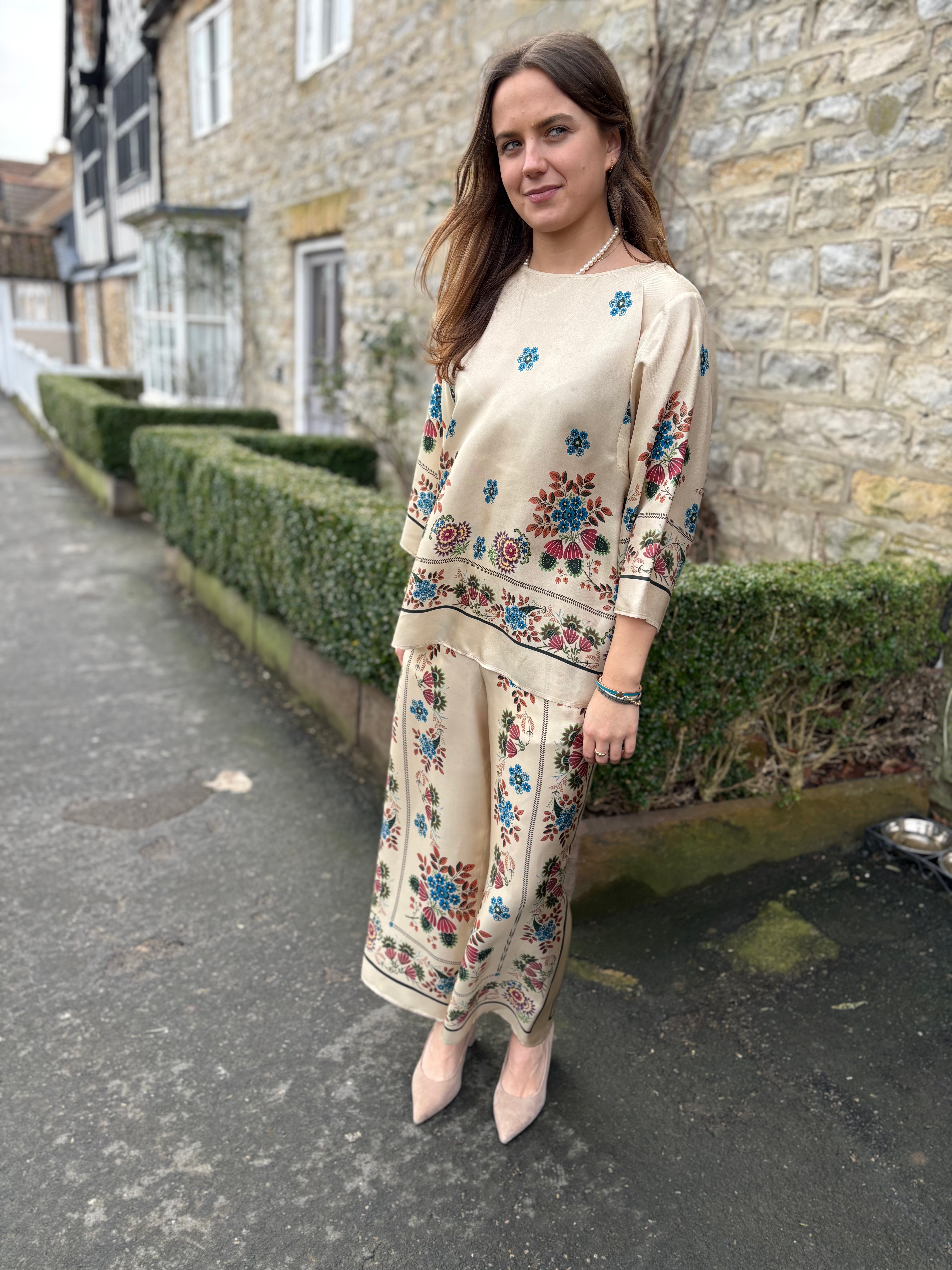 Elevate your wardrobe with these luxurious silk trousers, featuring a delicate ivory floral print that brings effortless elegance to any occasion. The soft, breathable silk fabric drapes beautifully while maintaining its shape, offering both comfort and sophistication. An elasticated waist ensures a relaxed, flattering fit that moves with you throughout your day. Perfect for dressing up or down, these versatile trousers are a timeless investment piece that celebrates natural beauty and refined style.