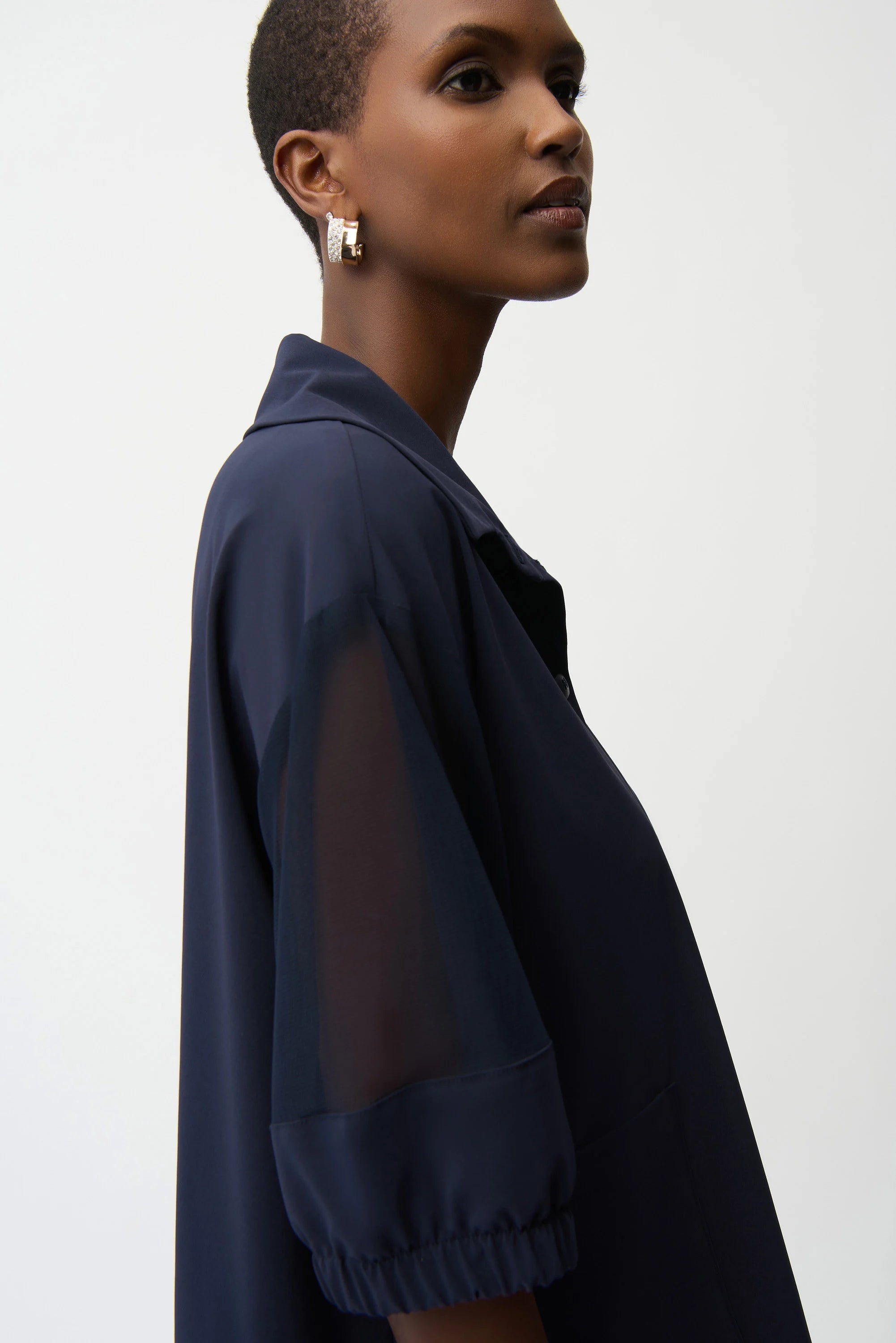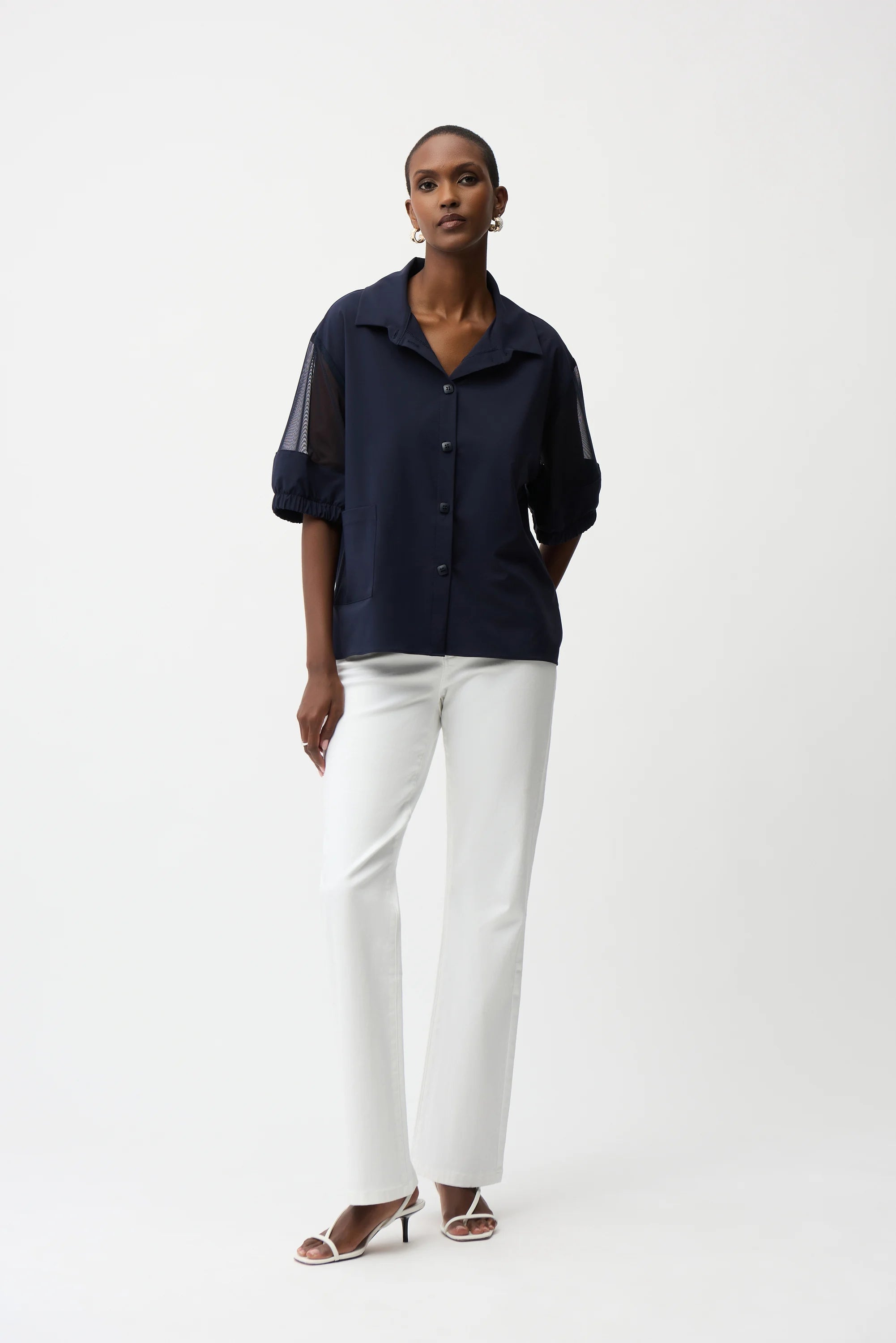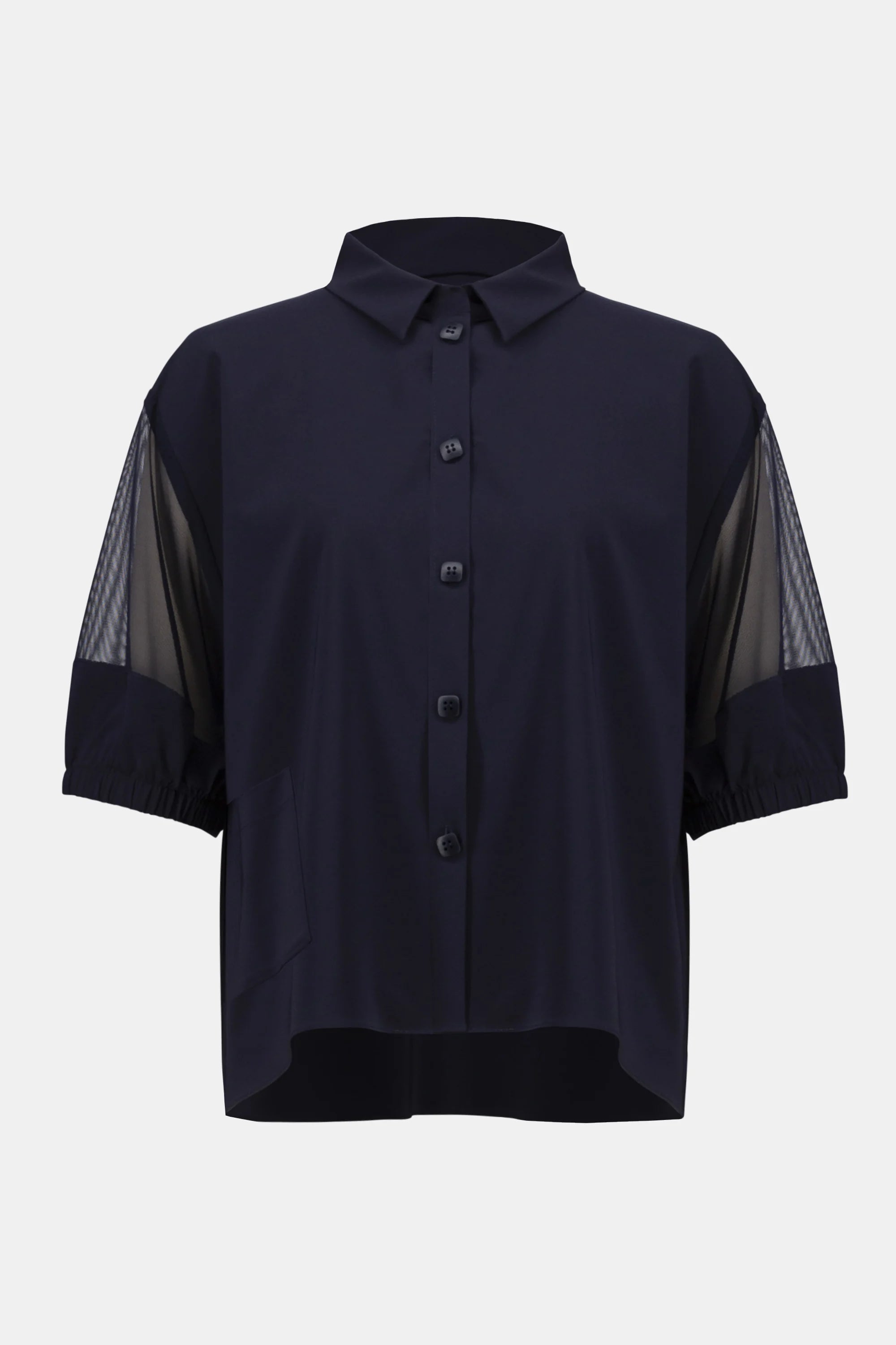 Sporty with a modern twist, this boxy blouse pairs stretch poplin with breathable mesh. Designed with a classic shirt collar, elbow-length dolman sleeves, and a single appliqué pocket for a crisp finish.