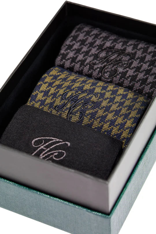 • The Men’s Sock Gift Box offers a selection of classic dress socks, each crafted for a sleek, comfortable feel using premium viscose and nylon yarn. The set includes two pairs featuring traditional houndstooth checks, and one in a black solid colour. Each sock is finished with embroidered HC branding on the upper cuff, combining elegance with comfort, making it an ideal gift choice.