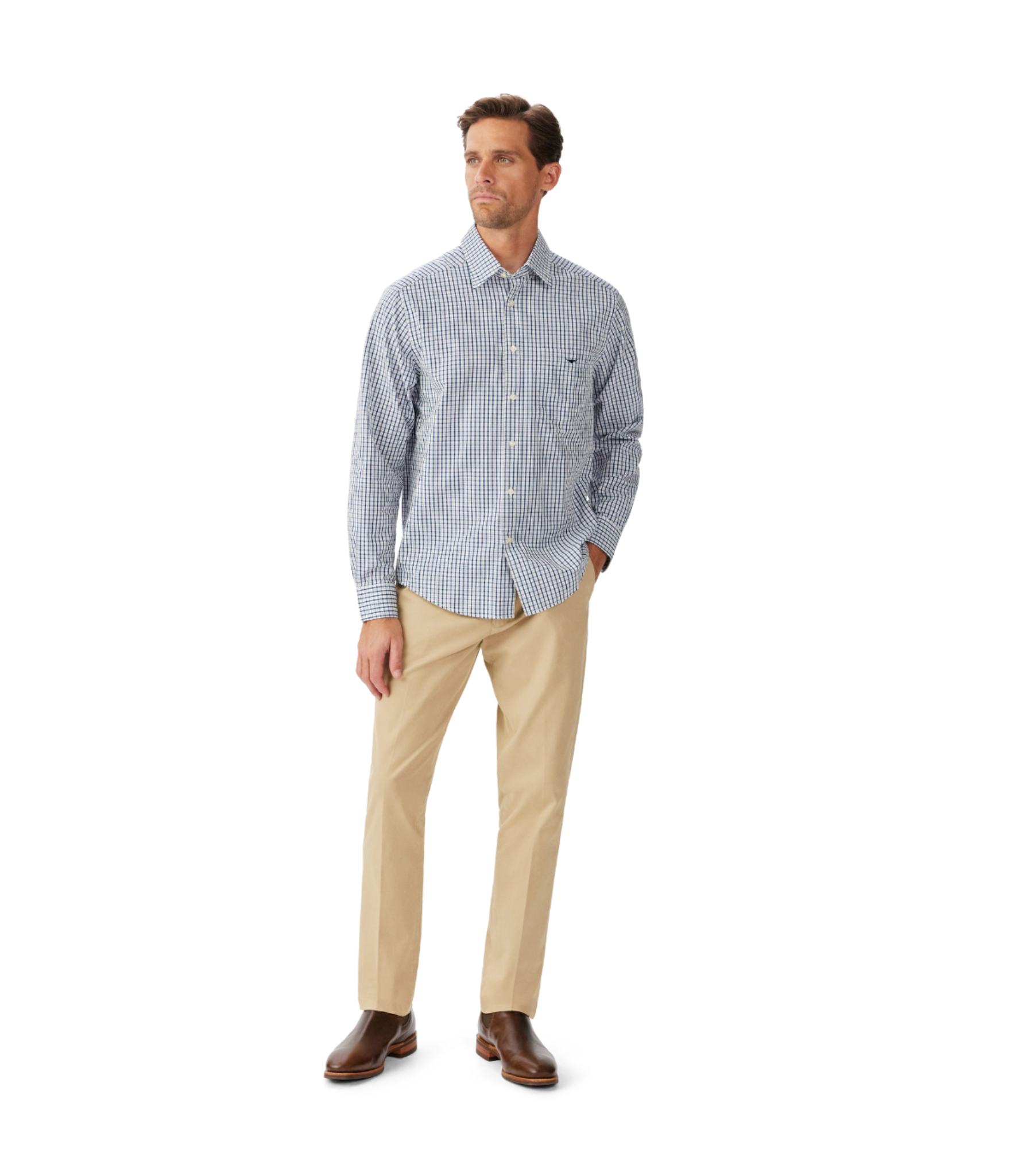- Regular full-length sleeves with double-button cuffs
