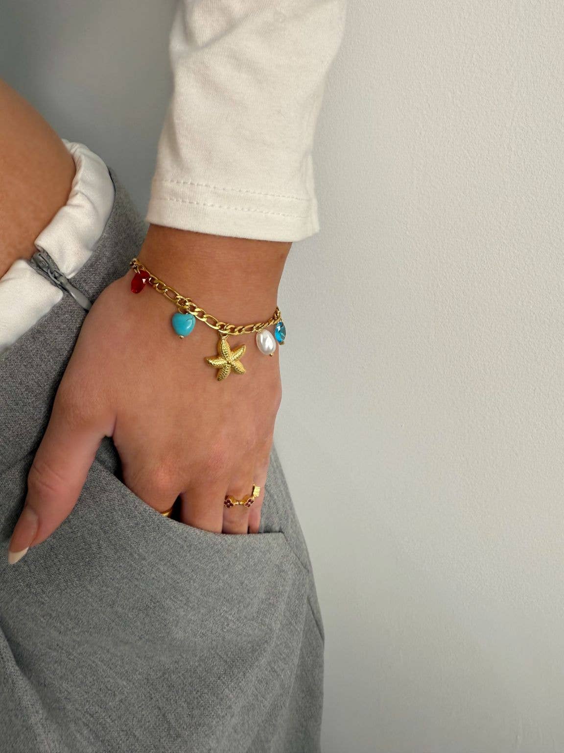 Starfish, Shell & Bead Charm Bracelet in Gold