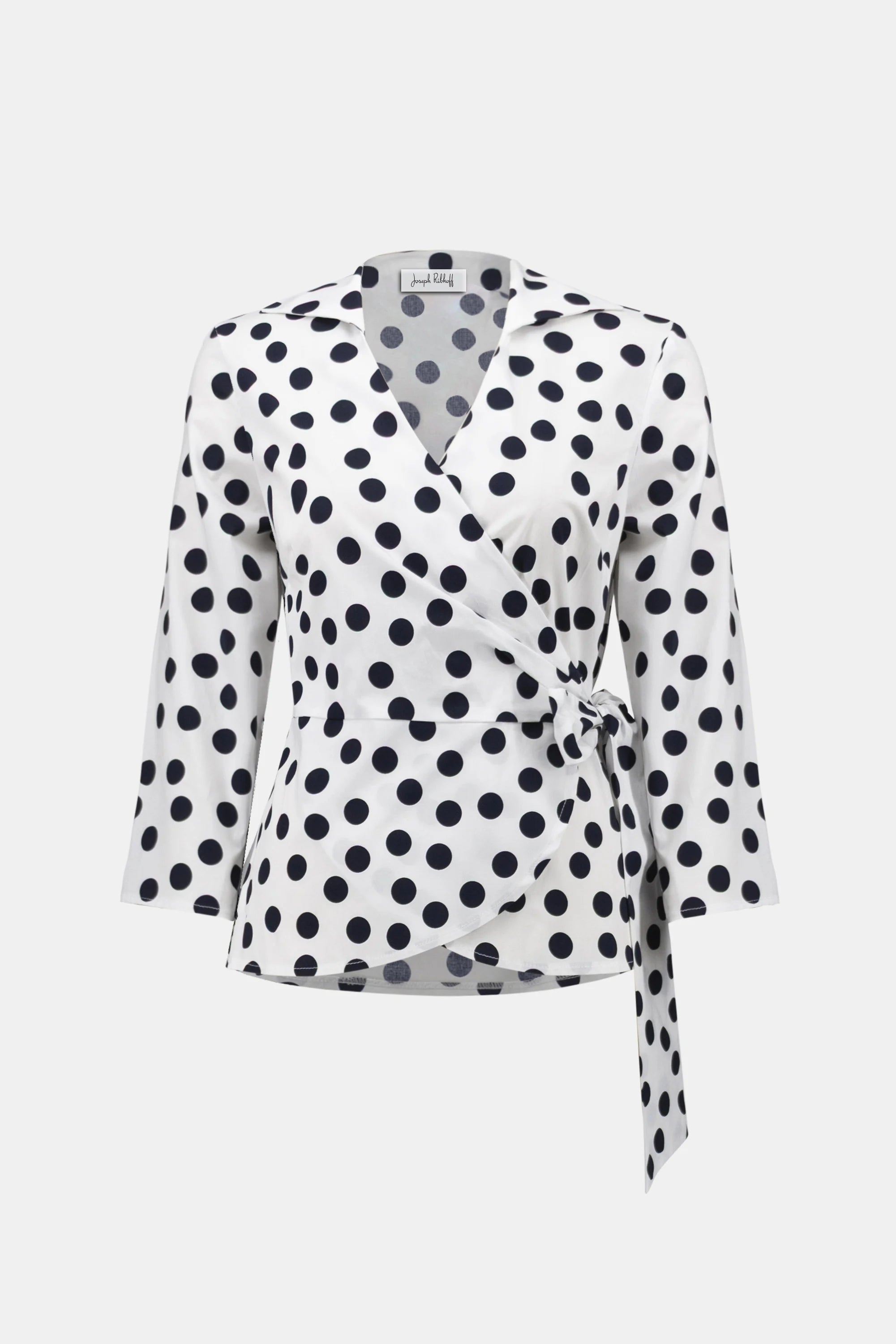 Classic with a twist, this printed poplin wrap top features crisp dots, a tailored shirt collar, and three-quarter cuffed sleeves. The side sash cinches the waist for a flattering, polished look.