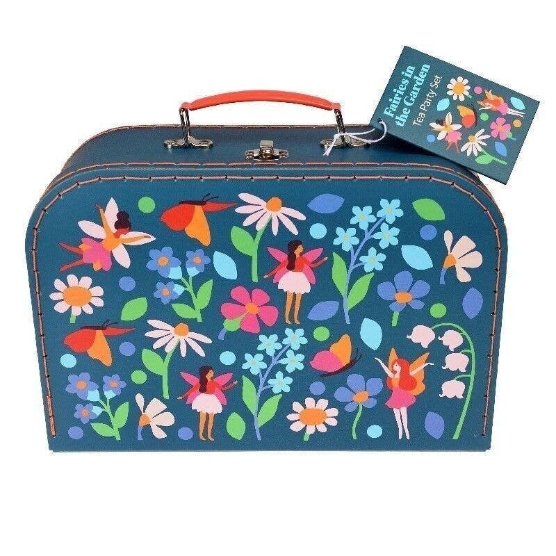 A 14-piece metal tin toy tea set in our Fairies in the Garden design. • The set comes in a cardboard case decorated with a bright colourful print of fairies among flowers and butterflies • Each piece of the tea set is also decorated with the same print • The tea set comprises: • Four cups • Four saucers • Four plates • One teapot • One serving tray • Not for children under 3 years.